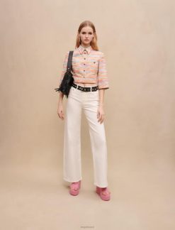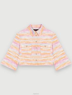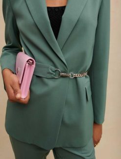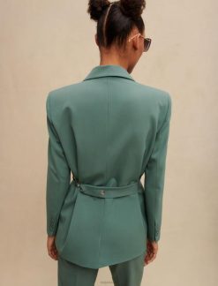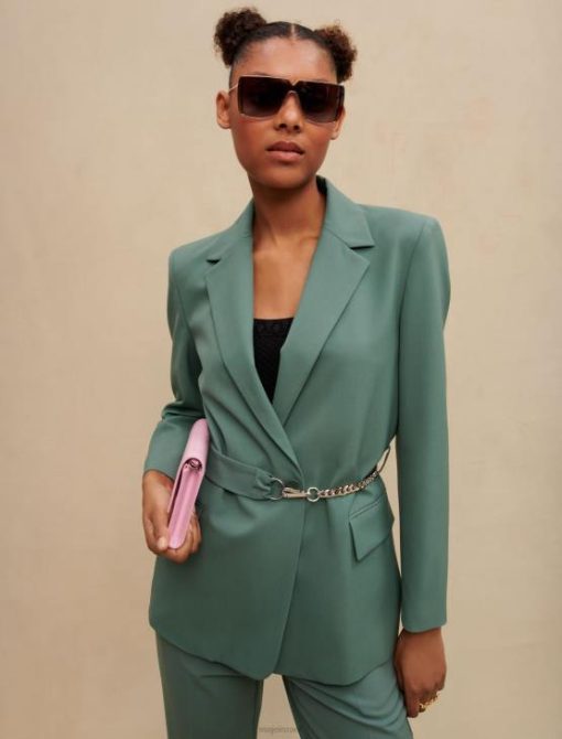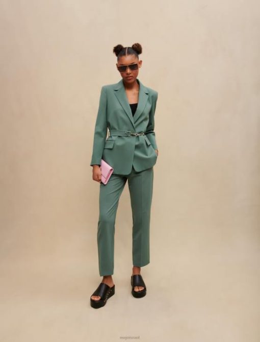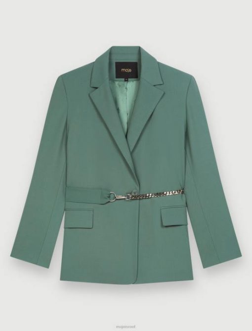 ז’קט משוחרר עם חזה כפול. שרוולים ארוכים וישרים עם כפתורים ושסעים בשוליים. חליפה מעט מתיחה. בטנת ויסקוזה עם ג’קארד מאייר. כיסי דש בחזית. חגורת שרשרת מתכת ניתנת להסרה עם כפתורי הצמד עם לוגו Maje. צווארון ושסע מאחור.