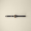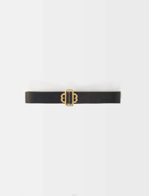חגורת עור שחורה עם אבזם מתכת בגוון זהב בעל אפקט עתיק עם לוגו תלתן.