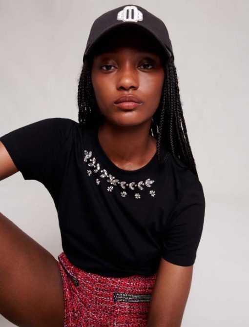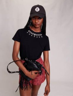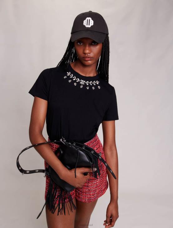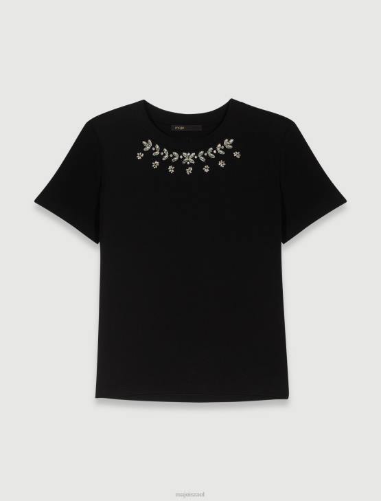 Maje נשים חולצת טי 100% כותנה עם אבני חן שָׁחוֹר הַלבָּשָׁה P8N835