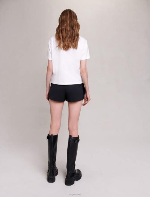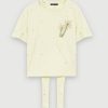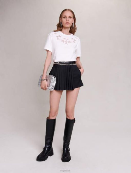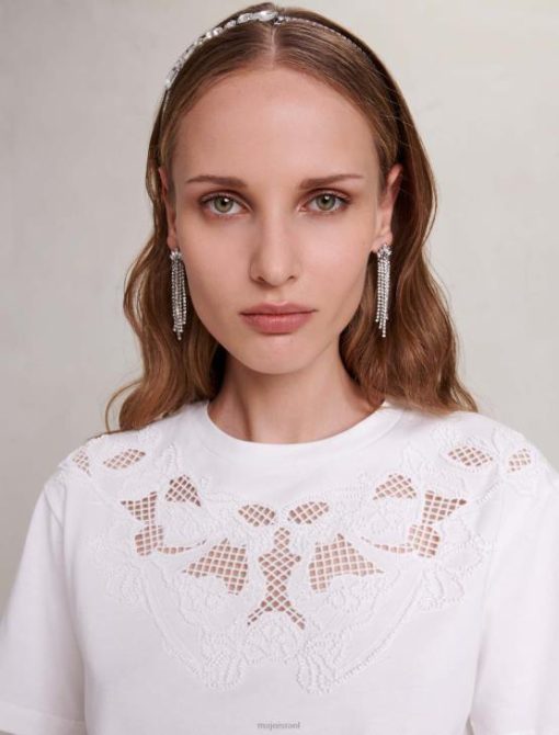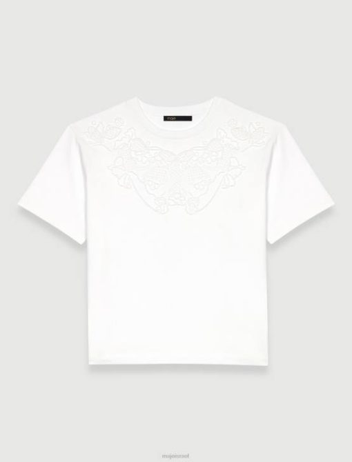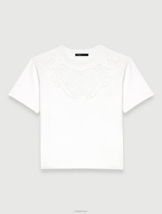 עם צוואר עגול ושרוולים קצרים, חולצת טריקו מכותנה זו כוללת פאנל קדמי תחרה רקום במלואו המעוטר בחרוזים בטון על טון.
