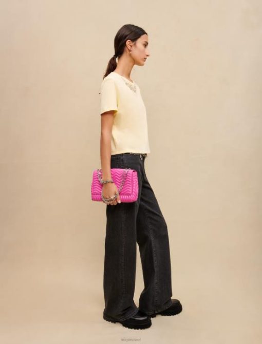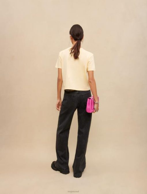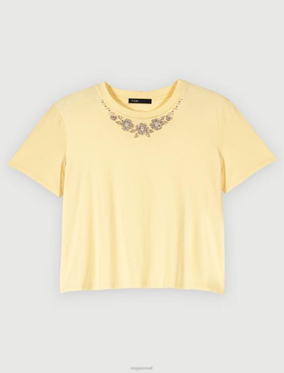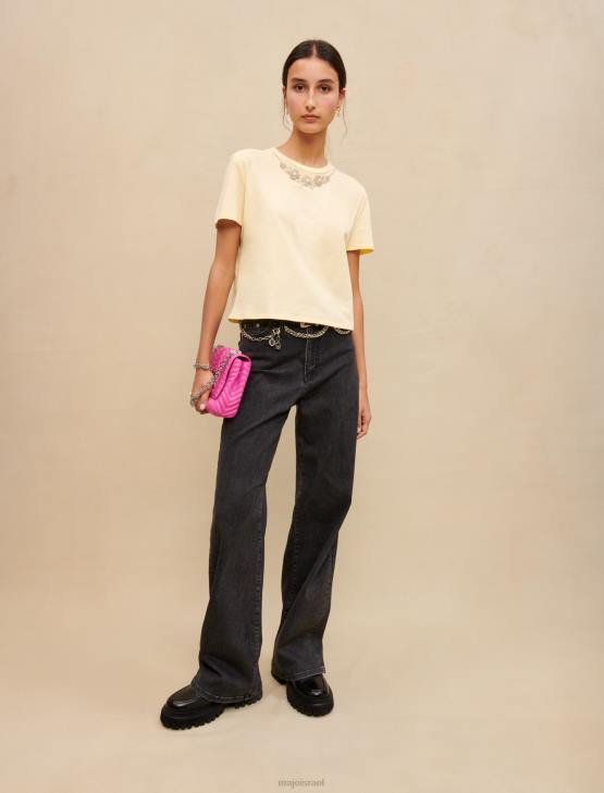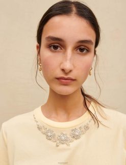 חולצת טריקו מכותנה עגול צוואר זה חוזר על מרכיב עיקרי בארון, ומאמצת העונה צבע צהוב פסטלי. הצווארון שלו מעוטר באבני חן כסף. זה מושלם ליום במשרד.