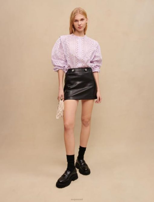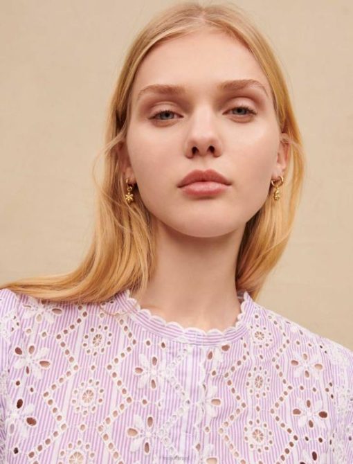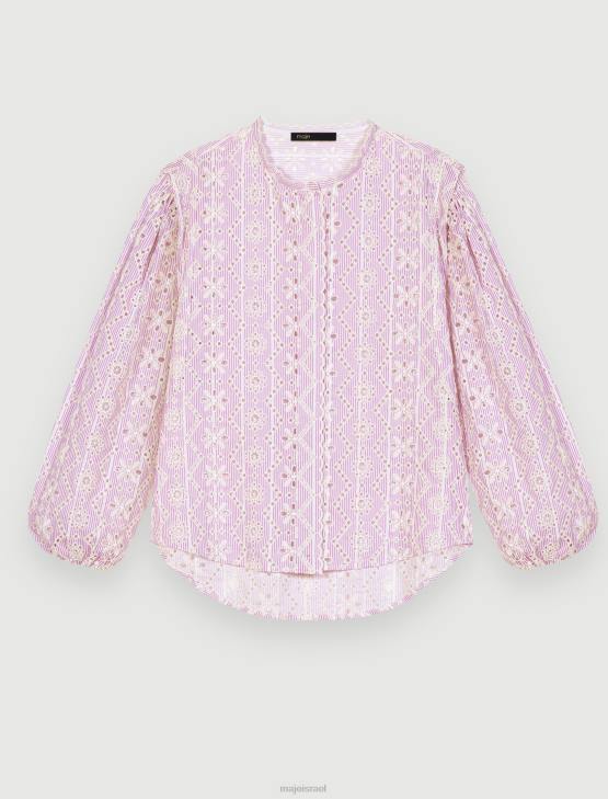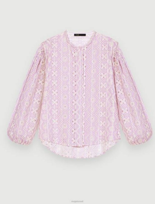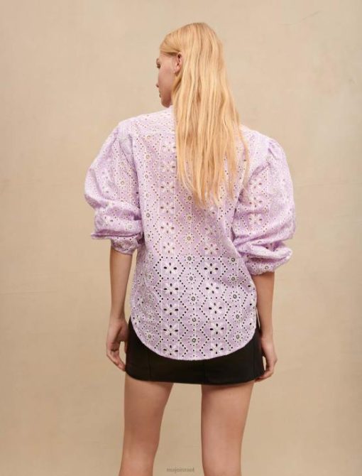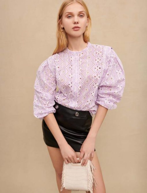 החולצה הרומנטית הרקומה במלואה הזו מגיעה בגוון סגול עם מוטיבים פרחוניים מנוגדים לבנים עדינים. הוא כולל שרוולי נפח ארוכים ופרטים מסולסלים עדינים בצווארון ובכיסום הכפתורים.