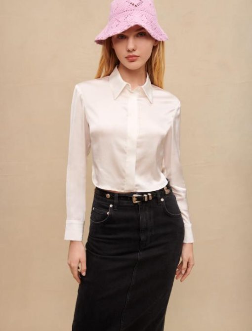 העונה, החולצה בסגנון סאטן עודכנה בגרסה קצוצה, זורמת וקלילה. יש לו שרוולים ארוכים, צווארון קלאסי וכיסום כפתורים מכוסה. שנועד להשלים את המראה הלבוש ביותר שלך, הוא גם ישתלב היטב עם ג’ינס דהוי למראה נינוח יותר.
