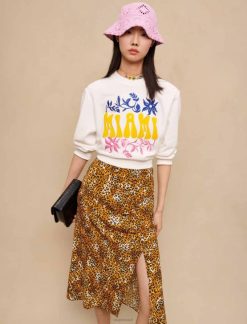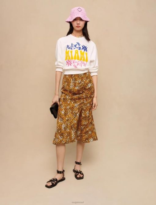 בעונה זו, מאיי חוזרת על הדפס הנמר בגזרות אולטרה-אופנתיות, למראה הקיץ המתאים לעיר כמו לחוף הים. מעוטרת בהדפס נמר פראי, חצאית המידי בגזרה גבוהה עם סגירת רוכסן היא מעט מתרחב בחלק התחתון, שיושב ממש מתחת לברך. הוא כולל כיסוי די אסימטרי בצד וחריץ בגובה הירך. העיזו ללבוש אותו בשילובים נועזים עם הדפס גרפי מנוגד או סווטשירט קז’ואל, או בחרו במראה נמר טוטאלי עם חלק עליון תואם.
