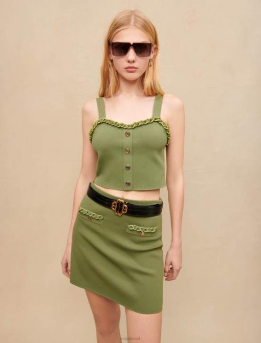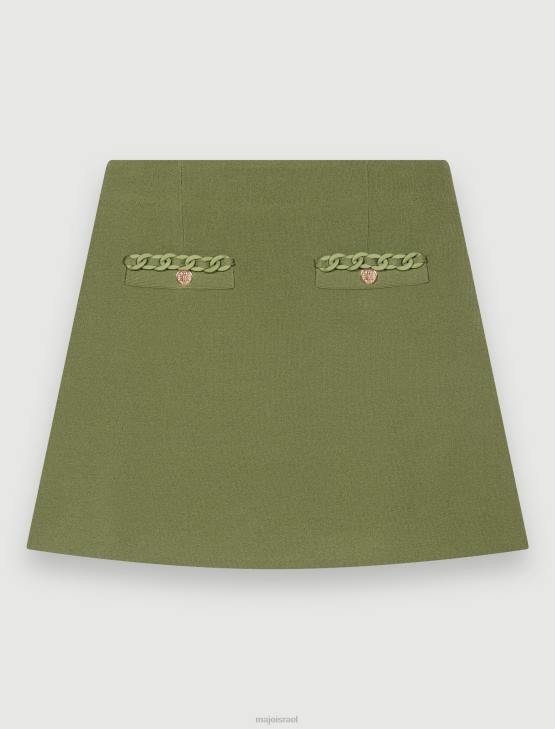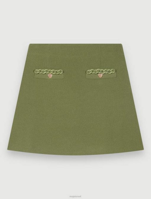 מעוטרת בשרשראות גומי מט משתלבות לאורך הכיסים, חצאית מיני בגזרה ישרה זו תיקח אותך מעונה אחת לאחרת, בשילוב עם סריגי חורף או חולצות קיץ. הוא כולל כפתורים משוכללים וניתן להתאים אותו לחלק העליון התואם לאנסמבל אופנתי ומודרני.