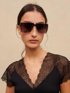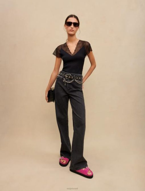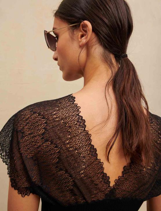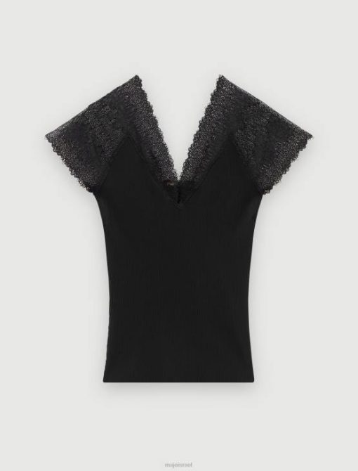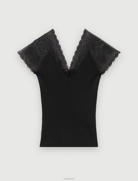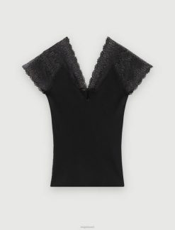 Maje נשים טופ ג’רסי עם עיטור תחרה שָׁחוֹר הַלבָּשָׁה P8N8113