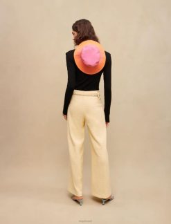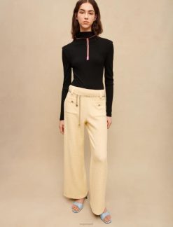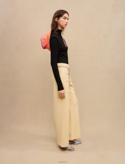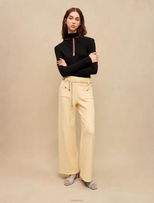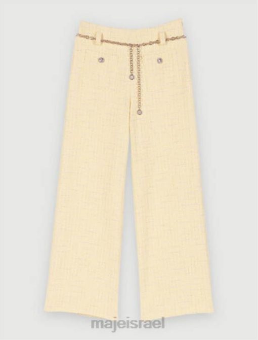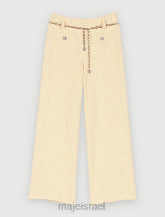 מכנסי טוויד צהובים פסטליים אלה משופרים על ידי חוט לורקס כסוף. יש להם חגורת שרשרת תלתן בגוון כסף. ההתאמה הרופפת שלהם מבטיחה מראה אלגנטי ומודרני.