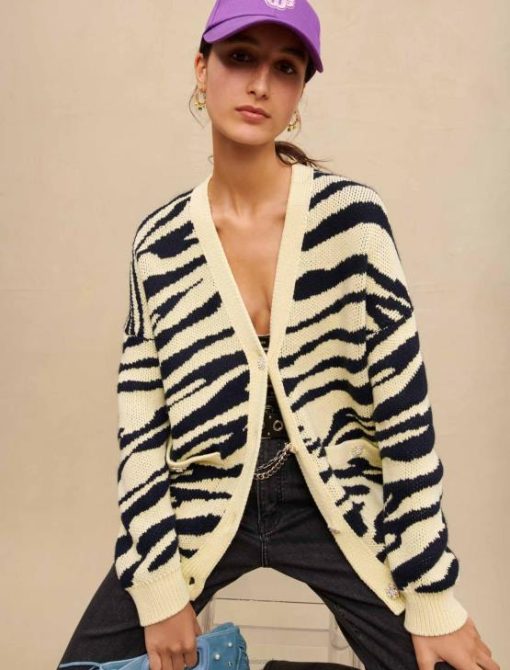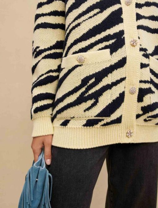 הקרדיגן המגודל הזה שמתהדר בהדפס זברה הוא גרסה חדשה של אחד מהסגנונות הנצחיים של העונה. כפתורי התכשיטים שלו מוסיפים מגע מסוגנן. יש לו שרוולים ארוכים והסריג הכפול המצולע שלו נותן לו יותר מרקם. מושלם ליום במשרד.
