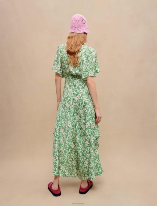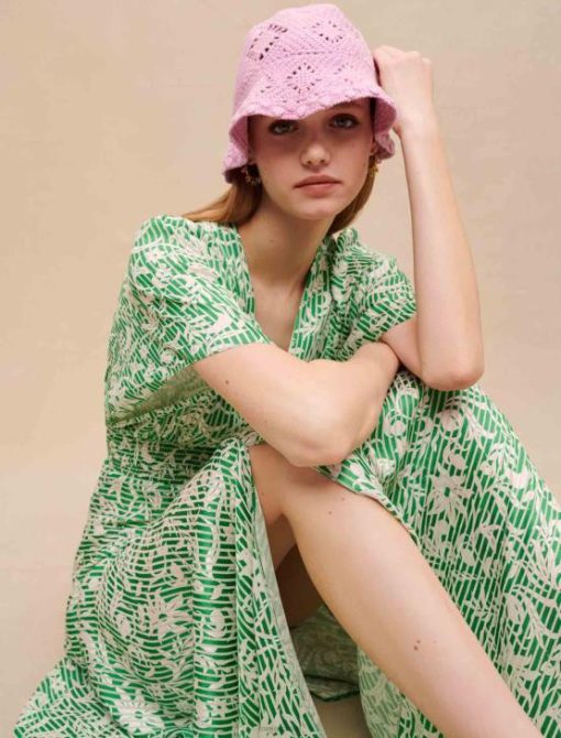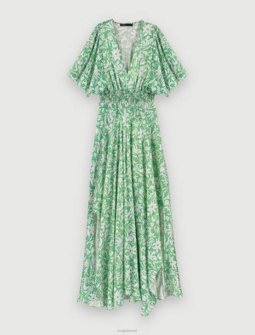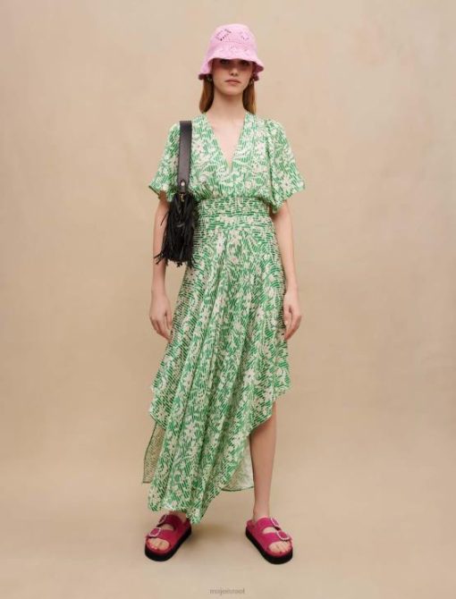 maje הניחה מעט קלילות וחולמניות בקולקציית שמלות הקיץ שלה. ארוכה וא-סימטרית, שמלת סאטן עם נפחים אווריריים מעוטרת במותן וכוללת צווארון V ושרוולים קצרים.