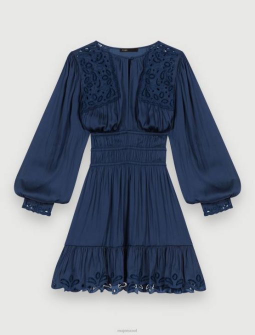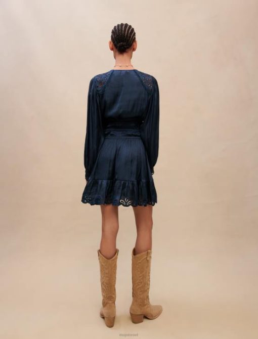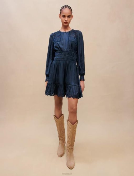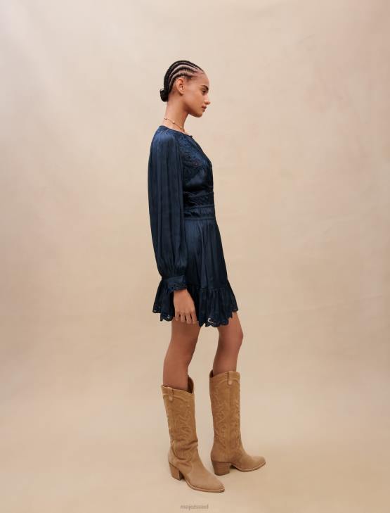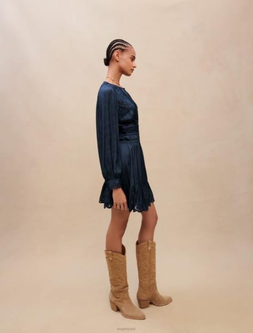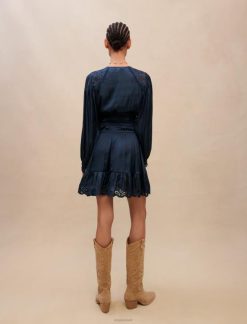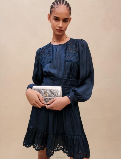 השמלה האולטרה-נשית הזו בגוון כחול כהה נכרכת במותניים בחלוקים. הוא מעוטר ברקמה עדינה על הכתפיים, שולי החצאית והחפתים. מושלם לערבי לבוש בחוץ.