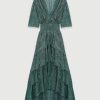 שמלה ארוכה, מהודקת במותן על ידי חלוק. בד צולע מתוח צף בצבע רגיל. שרוולים קצרים וישרים. החלקה ניתנת להסרה. צוואר V. סלסולים על החצאית. שמלה לאירוע.