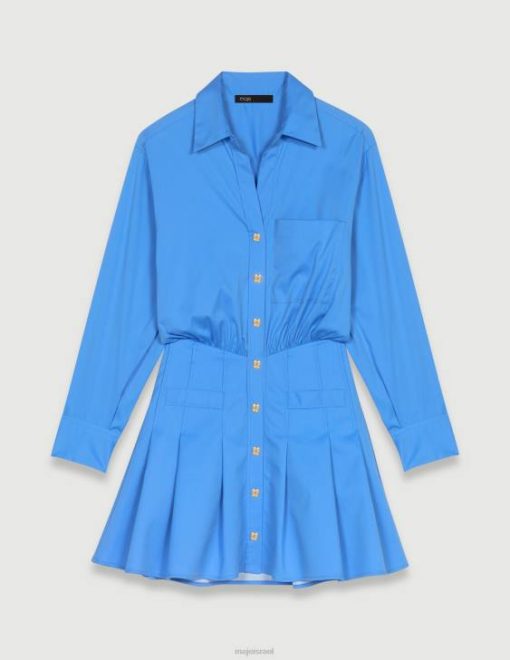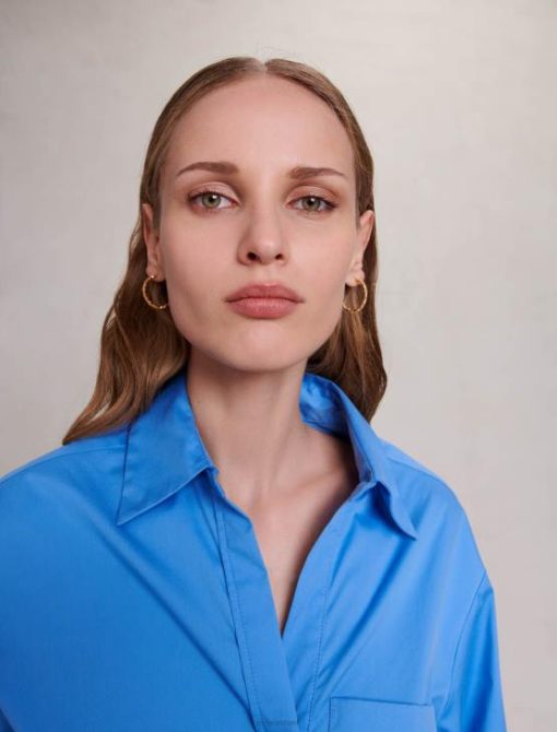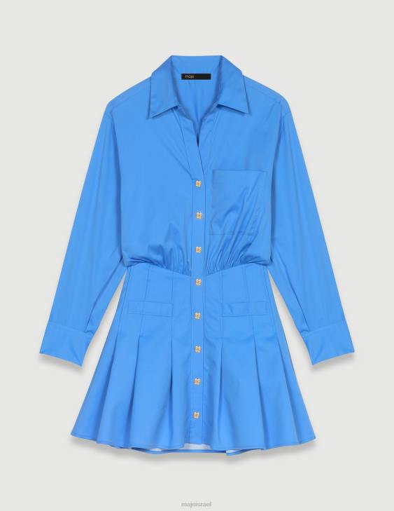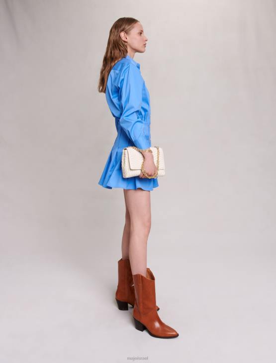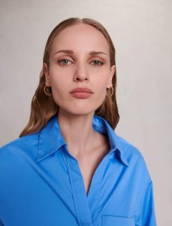 תן לעצמך להיסחף לעולם רומנטי עם השראה בריטית עדינה. נערת הכבוד מבטאת את עצמה באווירה פואטית ויוצרת מראות רומנטיים ומוכנים על ידי ערבוב של חלקים איקוניים. כחול בית ספר – הצבע הבולט של העונה – תופס את מרכז הבמה בשמלת חולצת כותנה קצרה זו, ויוצר צללית מובנית. כולל רצועת מותן אלסטית מאחור ושרוולים ארוכים עם חפתים מכופתרים, יש לו כיס חזה עם תיקון וכיסים מדומים. החצאית המתרחבת והקפלים שלה מעוטרת בלחצני תלתן בגוון זהב ונופלת בצורה מושלמת.