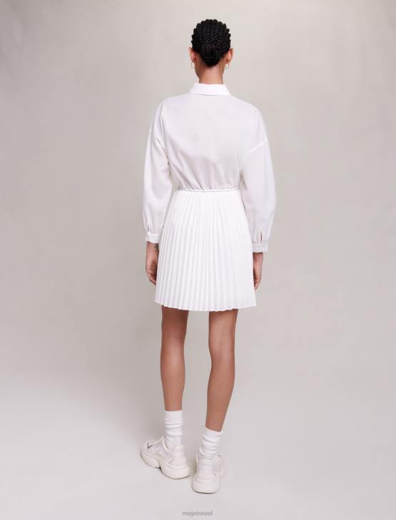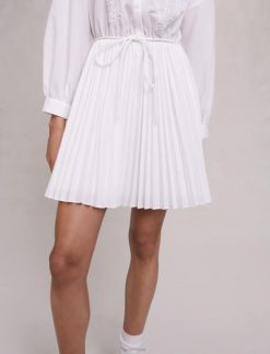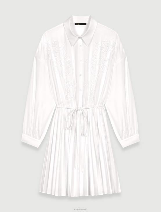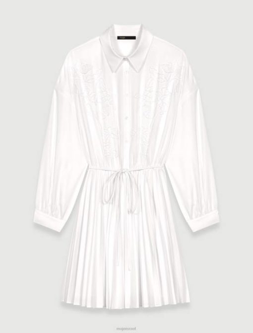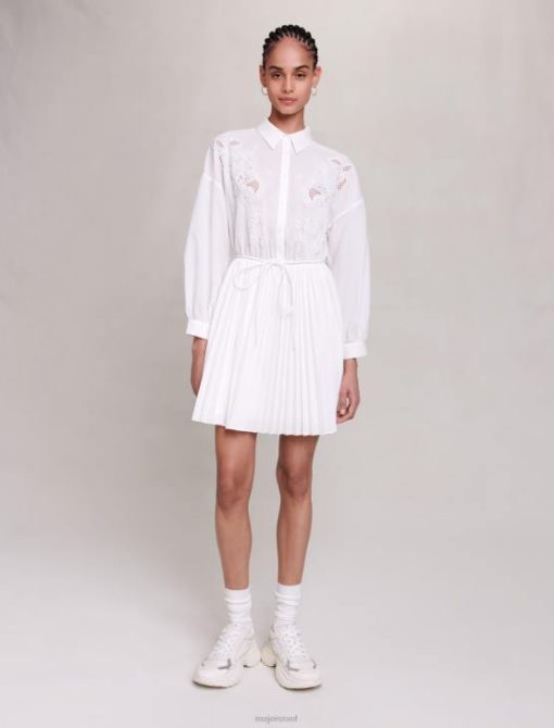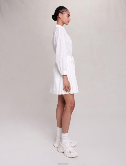 תטבלו בקולקציה החדשה שלנו, שבה האנרגיה הכובשת של החיים העירוניים פוגשת אלגנטיות נצחית. העונה, יש מראה חדש ומודגש ללבוש רשמי. שמלת החולצה הקצרה הזו, אידיאלית ללבוש יום או משרדי, היא בעלת מראה אלגנטי, קליל וקליל. יש לו חלק עליון וצווארון מכופתרים ושרוולים ארוכים עם חפתים מכופתרים. מעוטר בלוחות רקומים פתוחים מעוטרים בחרוזים, הוא נקשר במותניים עם קשירה ניתנת להסרה ויש לו חצאית קפלים מתרחבת.