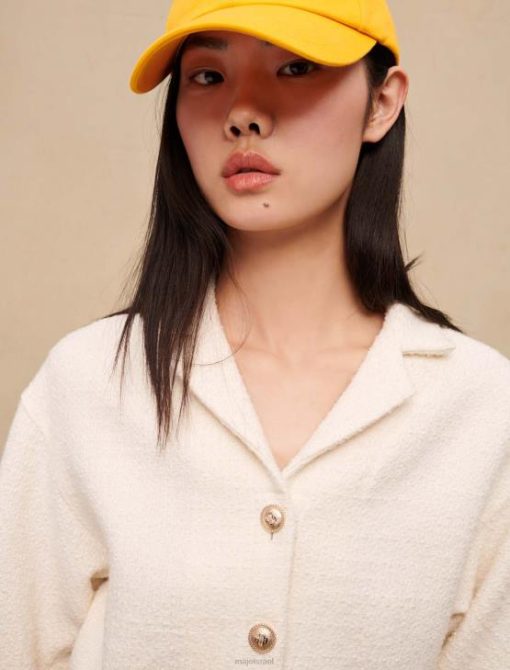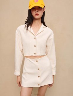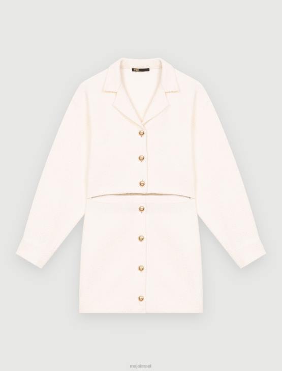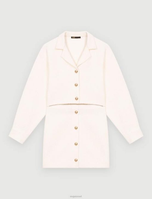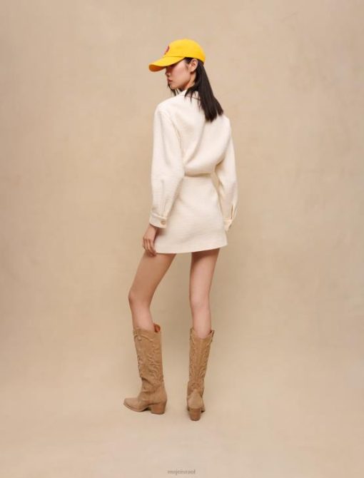 שמלה קצרה בגזרה ישרה, צמודה מאחור, בטוויד פנטזיה עבה עם מרקם. שרוולים ארוכים ורפויים עם חפתים. מרופד. צווארון וצווארון פתוח להתאמה באמצעות כפתורים. חצים מאחור. כפתורי מתכת בגוון זהב מלפנים. פתח קדמי במותניים. מושלם במשך היום לאירוע מיוחד או במשרד.