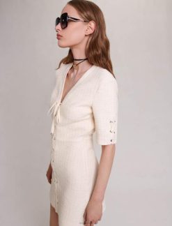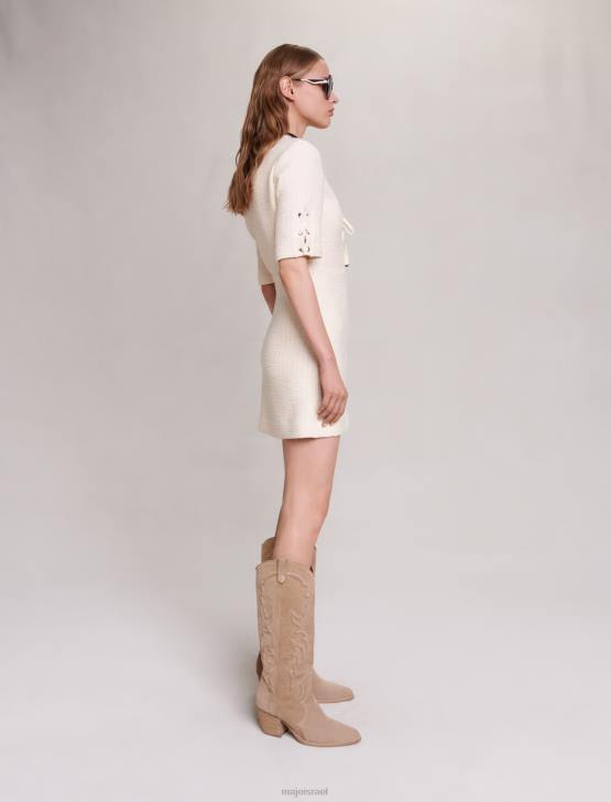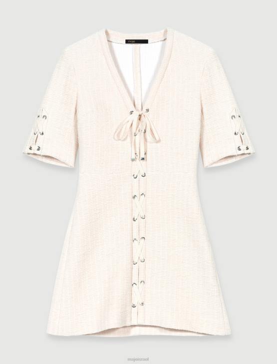 ב-ecru טוויד, השמלה הקצרה והישרה הזו יוצרת צללית מובנית ומסוגננת. הוא כולל ריגור רוכסן, צווארון V וחצאית מתרחבת מעט. לשמלה האופנתית והקז’ואלית הזו יש פירוט שרוכים לאורך ועל השרוולים הקצרים שלה, ומוסיפים מגע גלאם של סגנון רוק’נ’רול ללוק שלך.