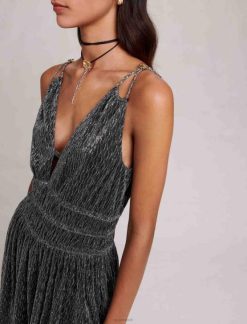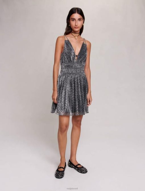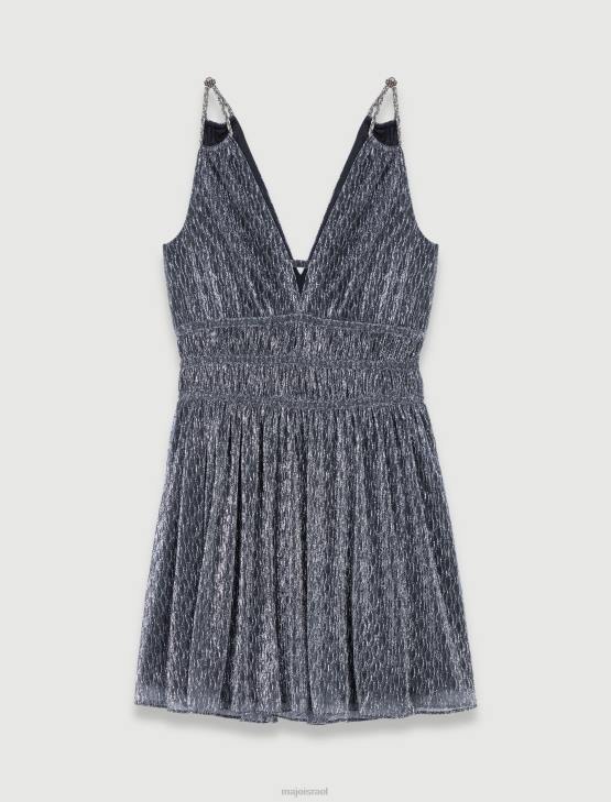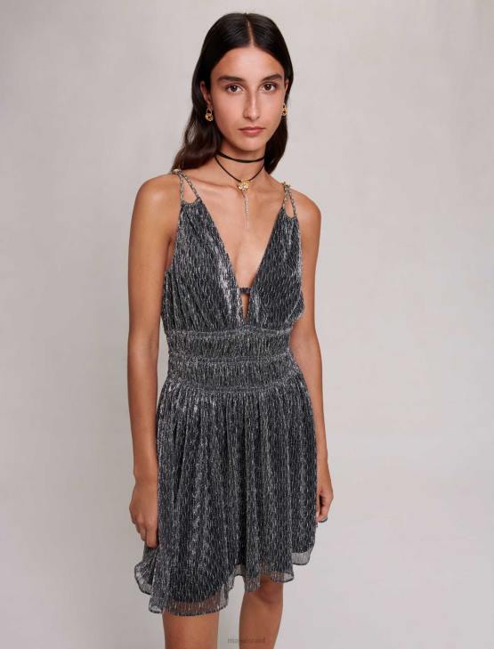 ללבישה ביום או בלילה, השמלה המתכתית הקצרה הזו היא לוכדת עין אמיתית. עם מותניים מעוטרים, הוא בולט בפרטים הנועזים שלו כמו צווארון צונח מעוטר בעול מלפנים ו-V מאחור, ורצועות קלועות הכוללות ניטים תלתנים. החצאית המתרחבת שלו יוצרת צללית דקה באלגנטיות.