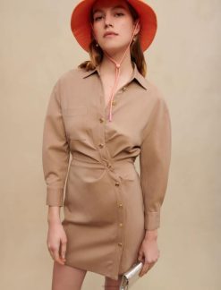שמלה ייחודית זו מכוסה בעדינות עם כיגור כפתורים א-סימטרי, וכוללת מותניים צמודים, צווארון V ושרוולים ארוכים. ללבוש אותו עם מגפונים למראה קז’ואל-שיק.