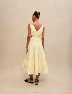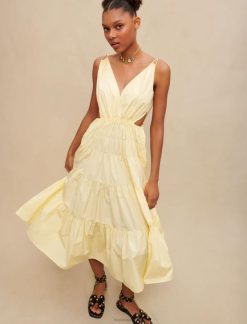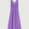 לכו על אלגנטיות אמיתית עם שמלת הטפטה הארוכה הזו עם העיצוב החתוך שלה והנפח המרתק. המותניים מודגשות על ידי רצועה אלסטית וחצאית התחתית בעלת המרקם העדין מעניקה לה מראה מתרחב. זה מנצח אמיתי עם הפרטים הנועזים שלו: רצועות צרות מעוטרות בצמות מתכתיות, צווארון V צונח מלפנים, מאחור, וחלקים חתוכים בחגורת המותניים החושפים הצצה לעור. לכו על קיץ מסוגנן ושלבו אותו עם סנדלים משובצים למראה קיץ שיקי להפליא.
