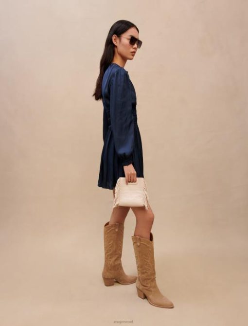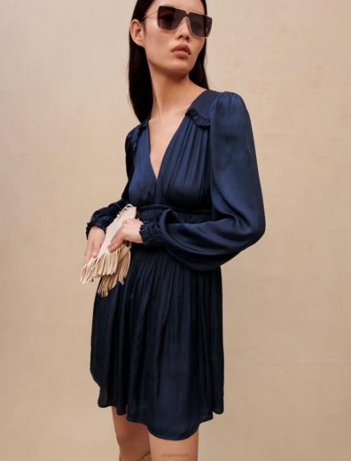 שמלה קצרה נשפכת, צרורה במותן ועם חצאית סאטן מתרחבת. שרוולים ארוכים ורפויים, אסוף ואלסטי בחלק התחתון עם גימור סלסול קטן. צוואר V. סמרטוט במותניים. התכנסות ומלמלות בחלק העליון של השמלה.