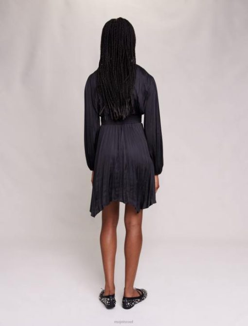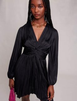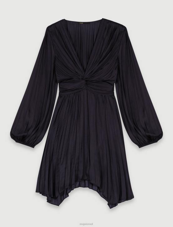 לכי על אלגנטיות עם שמלת הסאטן הקצרה הזו, המעוטרת בקו צוואר שמתעטף מהחזה ועד למותניים המובנים. יש לו שרוולים ארוכים, התאמה ישרה וחצאית קפלים בהתאמה א-סימטרית. עשוי מבד נמתח וקל משקל, פריט זה אידיאלי לאירוע או טקס מיוחד.